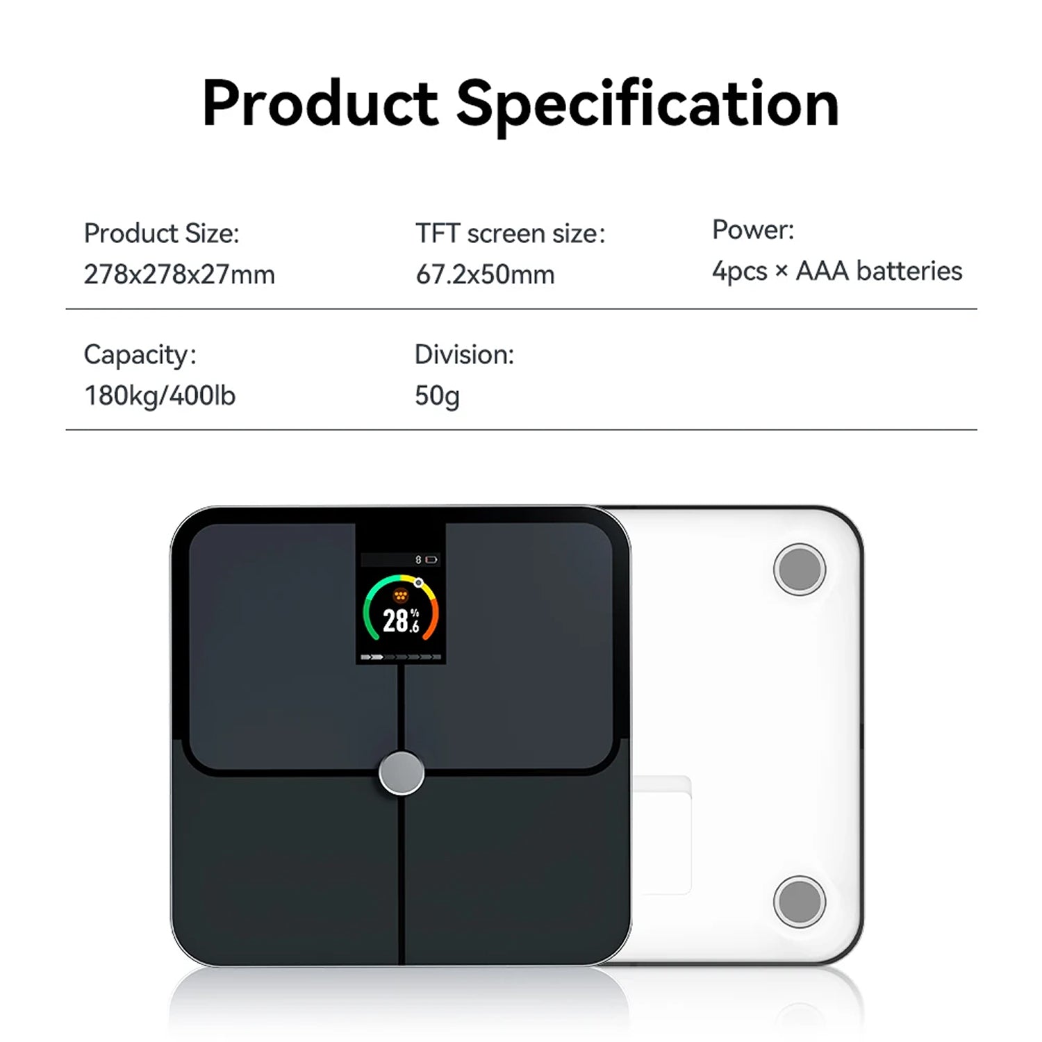 HIGH CAPACITY DESIGN Built to support up to 180kg/400lb with precise 50g increments, our durable construction and advanced sensors ensure accurate readings for users of all sizes and body types.