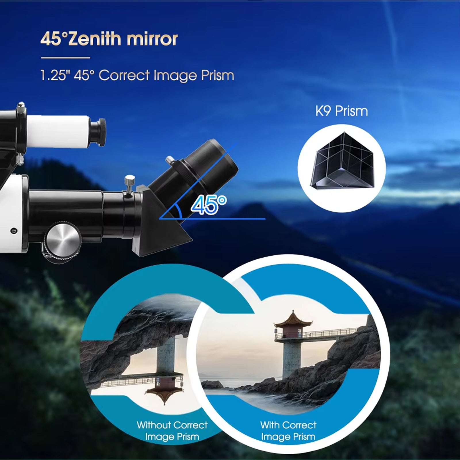 The 45° correct image prism provides comfortable viewing angles while delivering properly oriented images. Easy setup and intuitive controls make this telescope accessible to beginners of all ages, even with no prior astronomy experience.