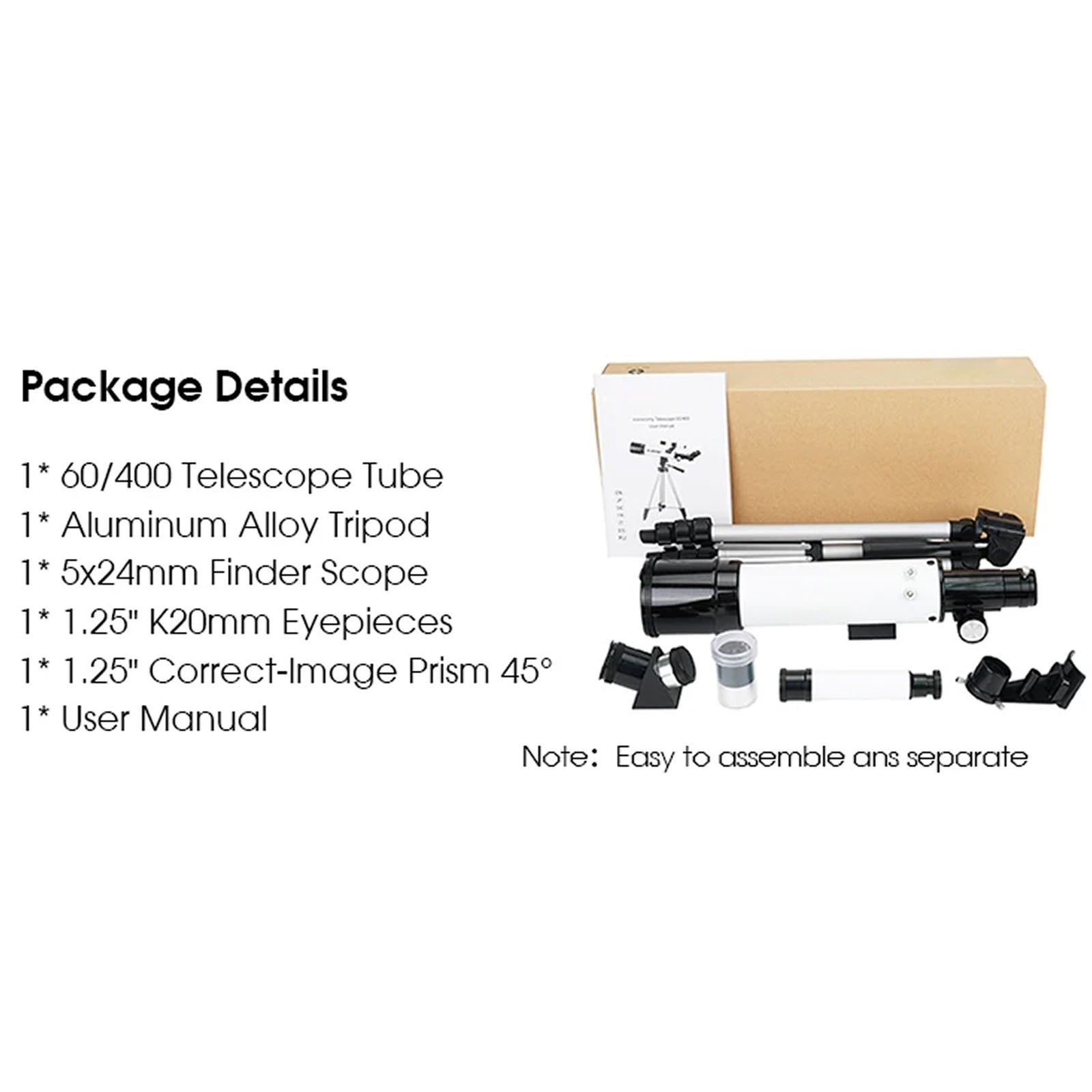 Our 60mm refractor telescope with multi-coated glass delivers bright, clear images of celestial bodies. The 400mm focal length provides excellent magnification while maintaining image quality for breathtaking views of moon craters and planets.