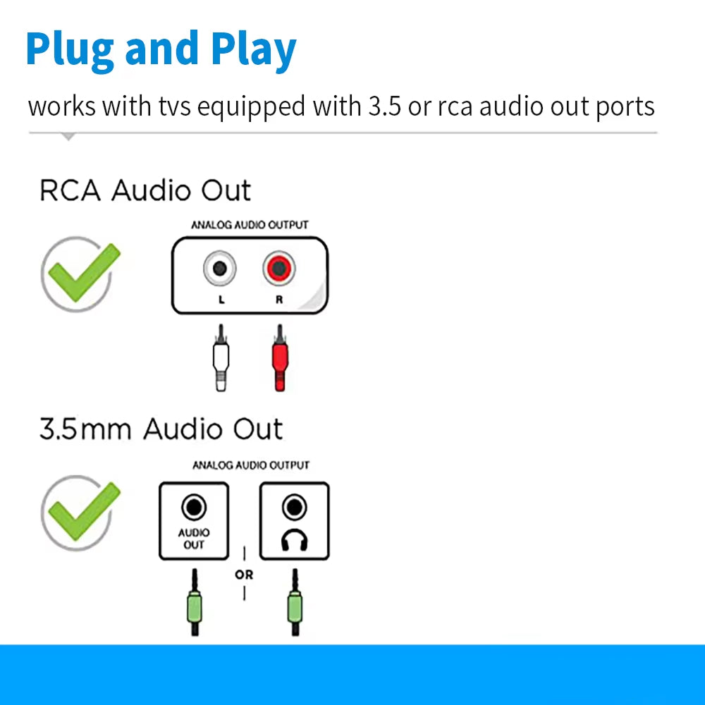 ZenSnugi supports RCA audio output (red/white cables) and 3.5mm connections. Simply connect the transmitter to your TV's audio output, and the headset will automatically pair when powered on.